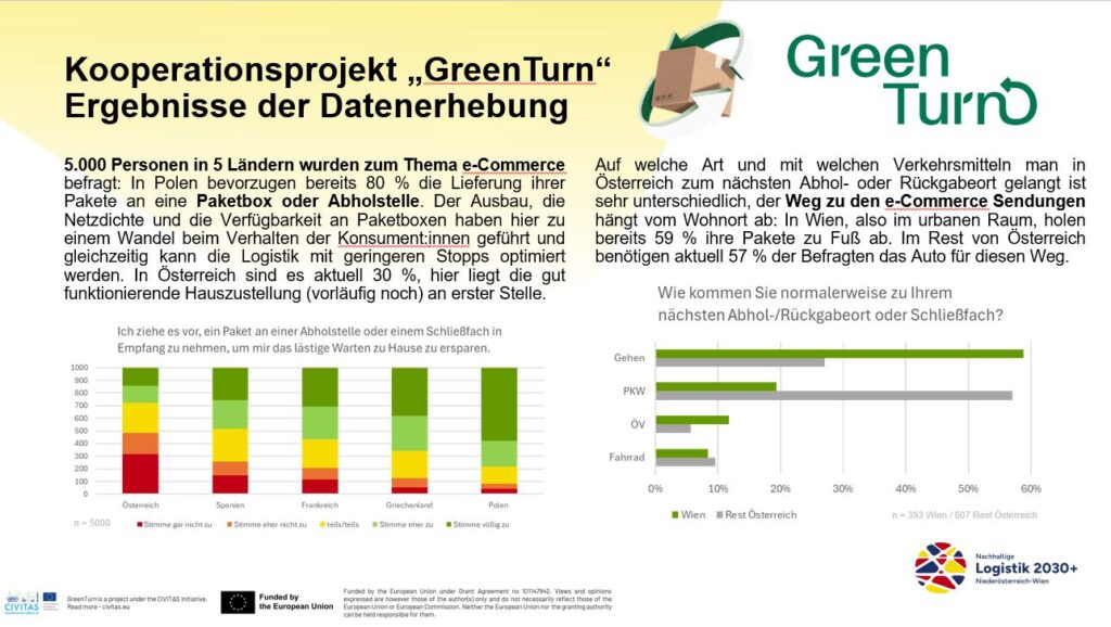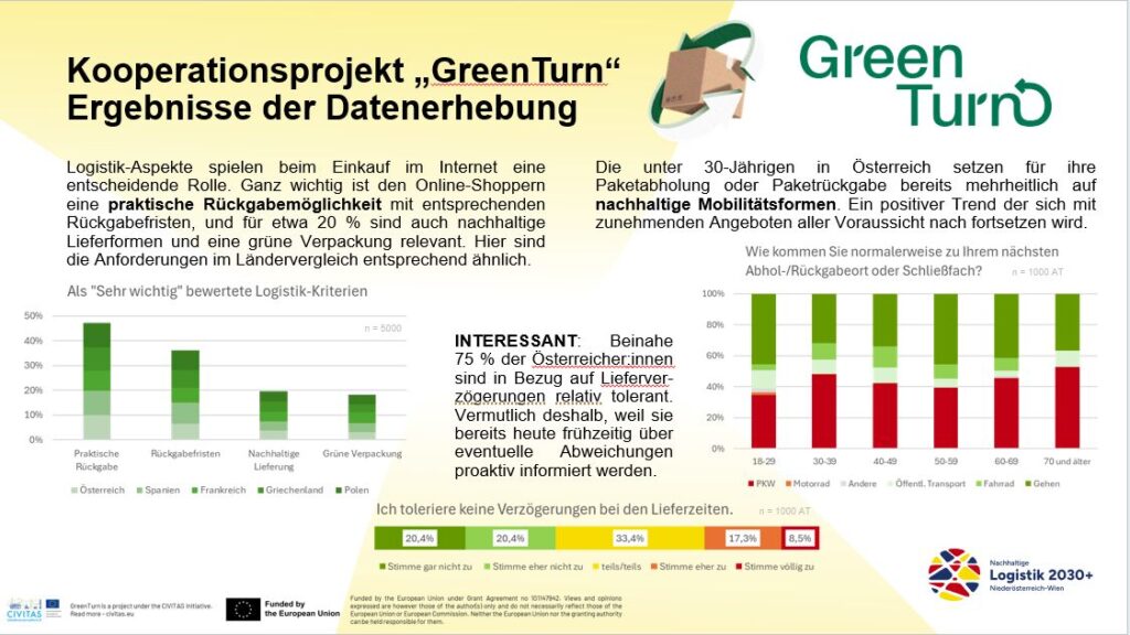 Die aktuelle Daten-Erhebung im Kooperationsprojekt Green Turn unter 5.000 Personen in 5 Ländern zeigt: In Polen bevorzugen bereits 80 % der Konsumentinnen und Konsumenten die Zustellung an Paketboxen oder Abholstellen – ein Trend, der die Logistik optimiert und Stopps reduziert. In Österreich liegt die Quote bei 30 %, hier dominiert noch die Hauszustellung. Auffällig: In Wien holen 59 % ihre Pakete zu Fuß, während im Rest des Landes 57 % das Auto nutzen. Praktische Rückgabemöglichkeiten, flexible Fristen und nachhaltige Lieferformen sind beim Online-Shopping besonders wichtig.