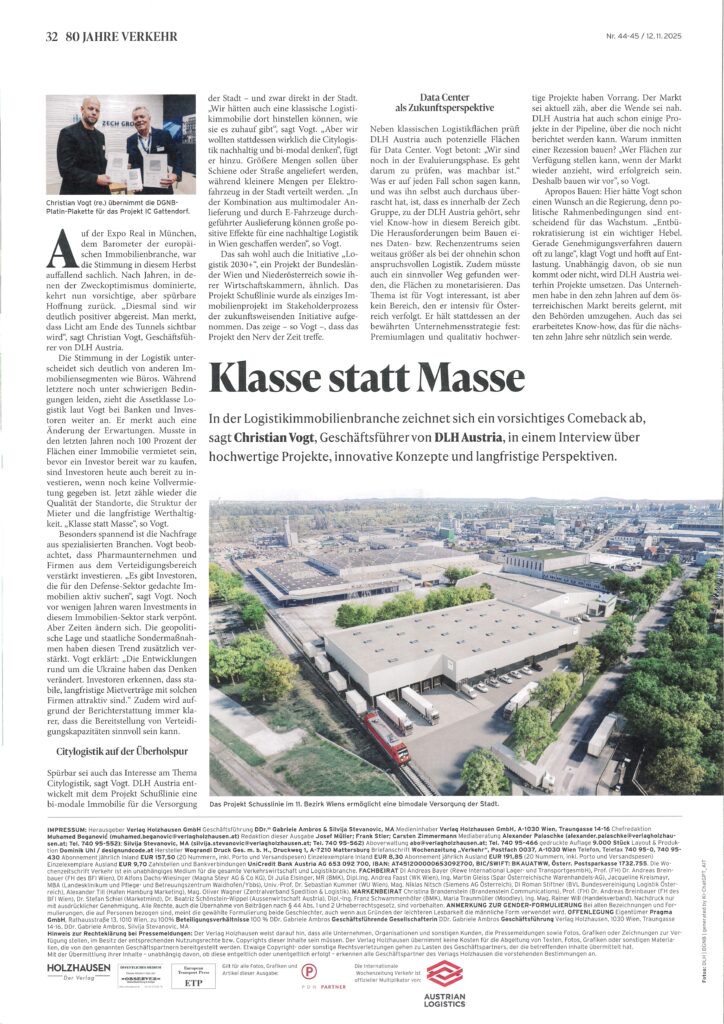 Nach Jahren des Zweckoptimismus kehrt die Hoffnung in die Logistikimmobilienbranche zurück. Auf der Expo Real in München zeigte sich: Die Assetklasse Logistik gewinnt bei Banken und Investoren an Attraktivität – nicht mehr Masse, sondern Klasse zählt. Hochwertige Standorte, nachhaltige Konzepte und langfristige Perspektiven rücken in den Vordergrund. Besonders spannend: die wachsende Nachfrage aus Pharma und Defense sowie innovative Citylogistik-Projekte wie das City Logistik Center Simmering am Standort Schusslinie im 11. Wiener Gemeindebezirk, das als Kooperationsprojekt in die Plattform Logistik 2030+ aufgenommen wurde.